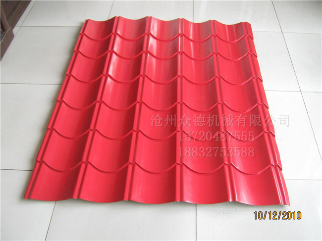 全自动828琉璃瓦彩钢压瓦机,该机器设备主要由装料架,装料架支座,进料导入平台,校平装置,压型主机,定型装置,成型剪切装置,液压泵站,全数控电脑自动控制柜等几部分组成. 机器简介:828琉璃瓦压型机的压型辊轮采用Cr12材质,经机床精车、精磨、镀硬络处理后,达58-62度,该压型机械压辊轮均采用精工数控车轮旋转成型,成型效果好,减少轮子和原材料之间的摩擦力,调试方便、,机器的任何零部件均采用配置,为的是机器的质量,压板平整,使用寿命长!